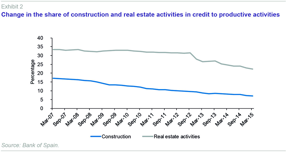 Exhibit 2 shows how the share of lending to construction and real estate activities in Spanish deposit-taking institutions’ credit to productive activities has changed. Lending to the construction industry contracted rapidly with the onset of the property crisis. From 150 billion euros in June 2008 it dropped to 100 billion in September 2011. The reduction in lending for real estate activities was much slower. Indeed, it continued to accumulate up until June 2009, peaking at 320 billion euros. In September 2011, lending for real estate activities still stood at 300 billion euros. 2012 marked the start of the significant drop in property risk exposure. In March 2015, lending to construction firms and for real estate activities accounted for 29% of total lending to productive activities, at around 190 billion euros, having dropped by 21 points since its peak. This implies that at its peak, 40% of lending was for construction and real estate activities.