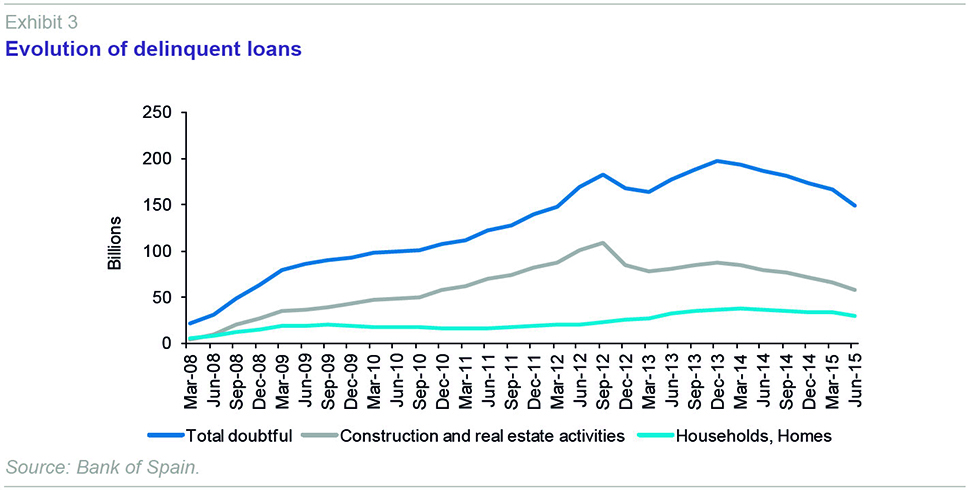 [4] In early 2014 a reduction in the volume of delinquent loans began, and this can also be clearly seen in the lending to the construction and real estate sector. This reduction in delinquent loans was the result of various processes. A portion of the non-performing loans was written-off, while another portion has been “cured” returning to performing status. Sales of portfolios of non-performing loans and shares in real estate firms, together with the cancellation of debts arising from property foreclosures also reduced the volume of loans classified as non-performing, although the latter case, does not, strictly speaking, reduce the risk exposure to the real estate sector. The evolution of the NPL rate shows a less pronounced drop than in the absolute values due to the contraction in total credit, although the trend has accelerated during 2015 moving from 12.51% in December of 2014 to 10.93% in June of 2015. Secondly, the delinquency rate for construction companies and real estate activities, which peaked at 37% in December of 2013, has dropped to 31.7% at the end of June 2015, although it remains very high. The delinquency rate for home mortgages of households was 5.45% at the end of June 2015.