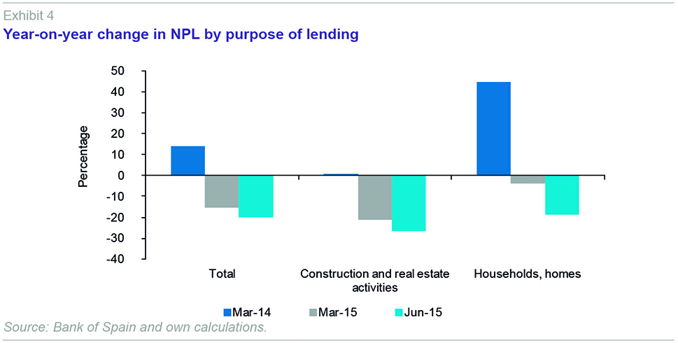 In order to analyse recent changes in default rates, Exhibit 4 shows the year-on-year change in the rate of doubtful assets by purpose of lending. Total defaults rose by 13.8% in March 2014 while they dropped by 19.9% in June 2015 with respect to June of 2014. The bigger drop in defaults corresponds to lending to construction companies and real estate activities, which reduced their doubtful loans by 26.7% (almost three times the rate of the drop in other lending to non-financial corporations). Doubtful loan rates for households to finance home purchases rose rapidly in March 2014, with a slight year-on-year drop in March 2015 to 3.6% and a faster reduction in June 2015 (18.6%).