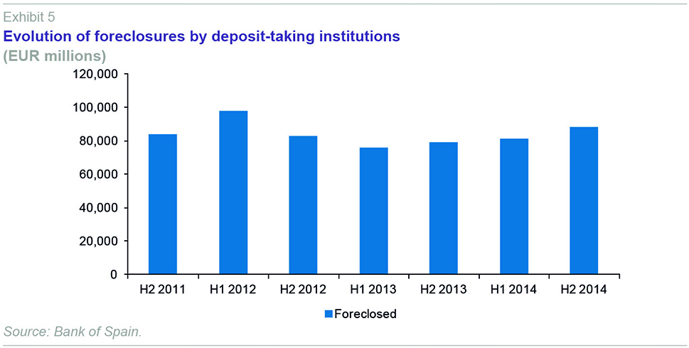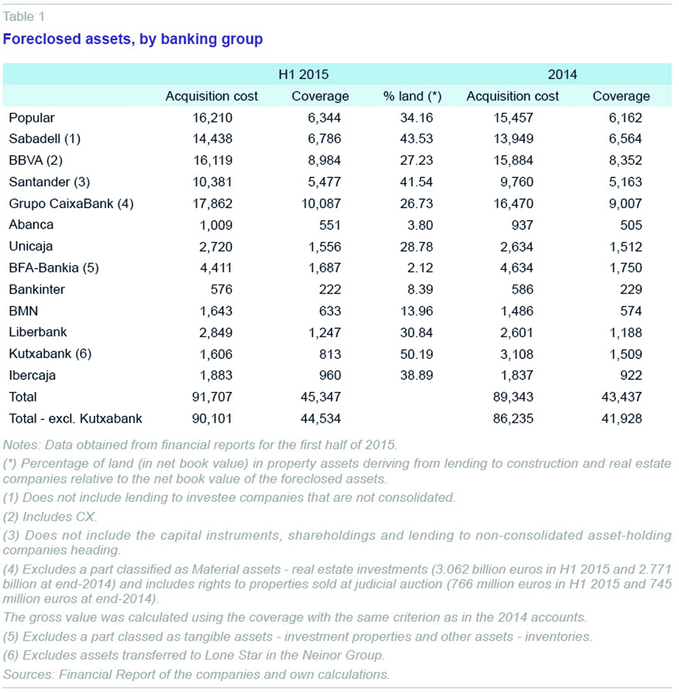 [7] Spanish financial institutions continued to accumulate foreclosed properties even after the transfer of assets to SAREB, and as Table 1 shows, the growth trend in foreclosed assets persisted into the first half of 2015. However, it is difficult to summarise the data on different institutions’ foreclosures as, although in theory, there is a uniform format in which this information is to be presented, some institutions have changed the classification criteria for some foreclosures or present data incompatible with that in the 2014 financial report. Table 1 gives estimates for cases in which no straightforward comparison of the six-monthly data and the data in the 2014 annual report is possible. In most cases, we have opted to maintain the information from the comparison between the first half of 2015 and December 31st, 2014, as shown in the report from the first half of 2015.