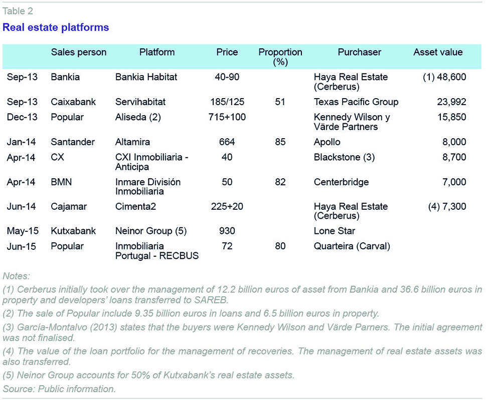 One of the strategies pursued to reduce property risk has been the transfer, whether voluntary or obligatory under the terms of restructuring plans, of the administration and management, or the ownership, of the real estate platforms where institutions concentrated their foreclosed assets. Table 2 shows the most significant operations. Some of these operations were linked to the management of assets transferred by financial institutions in Groups 1 and 2 to SAREB.