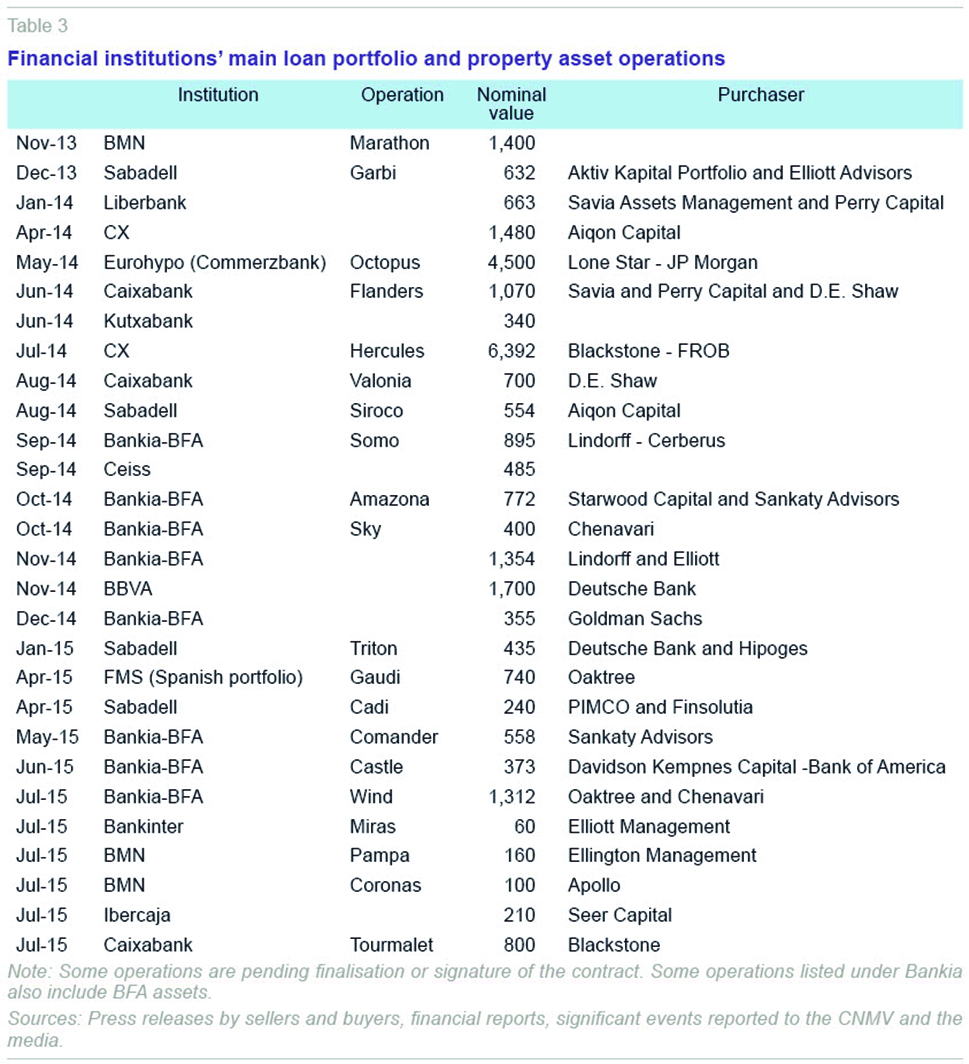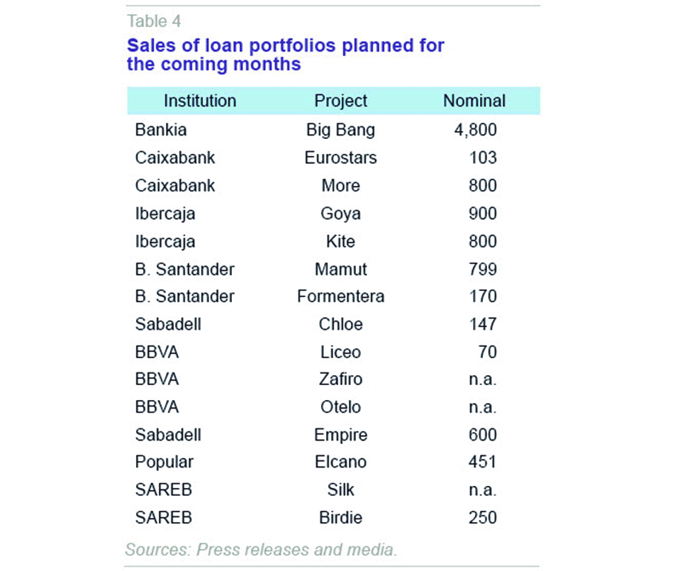 [10] often associated with real estate collateral. Table 3 shows the main loan portfolio sales since late 2013 (including portfolios comprising only written-off loans). The list does not include subsequent sales of assets bought from financial institutions. For example, in June 2014, Lindorff bought two billion euros worth of NPLs that had originally belonged to Santander, which had previously sold them to Fortress (Luna project) and TPG (one billion in loans inherited from when it took over the Octavia fund in 2013). Nor does it include the sale of real estate holdings (commercial or hotels), such as Banco Santander’s sale in May 2015 of a stake in NH, or the sale of interests in syndicated loans. Group 1 entities, in particular Bankia and Catalunya Banc, have been the most active in the sale of loan portfolios as part of the divestment of non-strategic assets as a result of the commitments made by the Spanish authorities to obtain the European Commission’s approval of their respective restructuring plans (“Terms Sheets”). The most significant operation was the transfer of Catalunya Banc’s Hercules portfolio, with a nominal value of 6.392 billion euros, to an asset securitisation fund (ASF) for its book value in the entity (4.187 billion euros), where Blackstone contributed 3.615 billion and the FROB 572 million. This highly complex operation involved three subportfolios and five tranches and attracted interest from almost all the funds investing in the Spanish loan portfolio market. Table 4 lists the loan portfolio sale operations announced but not completed. These include Bankia’s “Big Bang” project (4.8 billion), which is currently the second largest portfolio