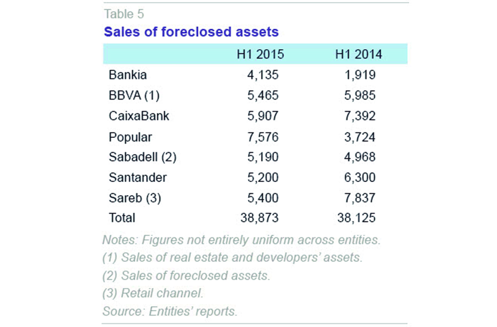Selling off foreclosed assets is another mechanism which banks can use to clean up the real estate exposure on their balance sheets. Table 5 shows housing sales by the main real estate platforms between the first half of 2014 and the first half of 2015.