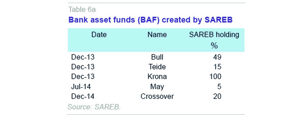In 2014 SAREB sold 15,298 properties via its retail channel, with a significant increase in the contribution from the sale of land (rising from 15% in 2013 to 26% in 2014) and a reduction in the contribution of residential property sales (from 80% in 2013 to 63% in 2014). As regards the retail lending channel, there has been a significant increase in the number of sale promotion plans, with 5,278 proposals managed (45.6% of the total proposals including dations in payment and foreclosures, and restructuring and refinancing) and 800 plans. It is worth noting that the retail channel generated 80% of SAREB’s income of 5.115 billion euros in 2014. Income from the wholesale channel, 1.115 billion euros, was concentrated in December 2014 (708 million euros) (SAREB, 2015). Table 6.a shows the bank asset funds (BAFs) created by SAREB since it began operating, and its stake in them. Table 6.b lists the portfolios and BAFs sold by SAREB in 2014, both of REOS (Real Estate Owned by lenders) and loans.