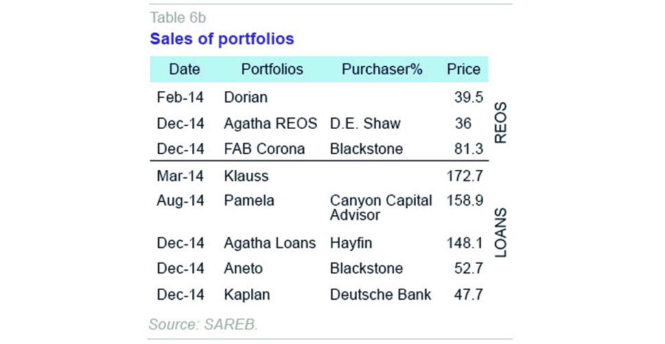 SAREB is a key player in the cleaning up of the Spanish real estate market risk exposure. SAREB’s portfolio was valued at 44.2 billion euros at the end of 2014. Real estate accounted for 13% of the value of the foreclosed properties on the balance sheet of the banks. The loans on SAREB’s balance sheet amount to 50% of the non-performing loans to construction and real estate activities of the financial institutions. SAREB began its activity in 2012 when it took over the assets of the financial institutions referred to as Group 1. When it took over the assets of Group 2 on February 28th, 2013, SAREB completed a portfolio of 50.781 billion euros (at acquisition cost) including financial assets (78%) and real estate assets (22%). Over the period 2013-14 it sold 24,000 properties, undertook 25 wholesale operations, and obtained total income of 9 billion euros. By end-2014 it had amortised 5.7 billion euros of debt from its balance sheet.