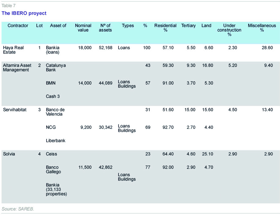 [8] The last major operation was Lone Star’s purchase of Neinor Group (Neinor, Inverlus, CajaSur Inmobiliaria and Valle Romano). With the sale of these platforms there are only two financial institutions that are still managing real estate platforms of a significant size: BBVA (Anida) and Banco Sabadell (Solvia). The conditions of the initial transfer of the management of the assets on some of these platforms were altered by SAREB’s change in its strategy for managing its products. This culminated in the assignment of new so-called “servicers” for its financial and real estate assets as a result of the Ibero project, described below. The future of these platforms involves their consolidation, a process that has begun with the sale of some debt-collection and real estate platforms, but has not yet reached the necessary scale. Moreover, some of the funds that invested in real estate platforms have taken part successfully in the Ibero project and have continued to buy real estate assets and loans to gain volume and improve asset management efficiency.