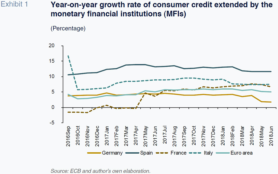 ECB data on monetary financial institutions (MFIs) allow us to analyse the trend in household consumer credit across the eurozone, including the weight of this loan segment in overall household borrowings. As shown in Exhibit 1, consumer credit has registered double-digit growth in Spain since September 2016. Most recently, it has posted average growth rates of 13% in 2017 and of over 10% in 2018, during which time the Spanish economy has also consistently outgrown the eurozone and its main economies. In addition to supply-side factors such as bank-dictated criteria and conditions,