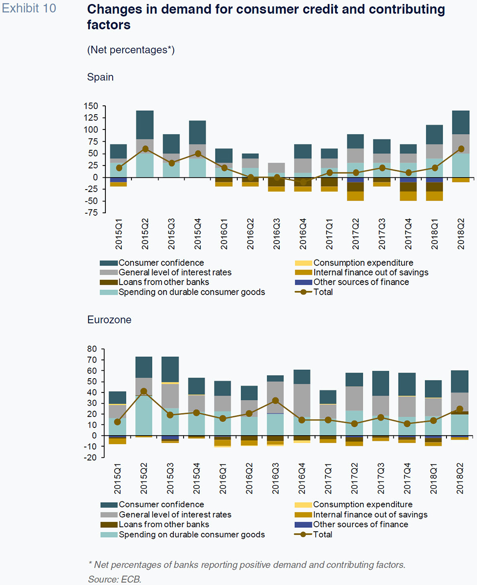 The ECB survey also enables an analysis of those demand-side factors that have contributed to the high rate of growth in Spanish consumer credit. Since the first quarter of 2017 (Exhibit 10), the percentage of banks reporting that demand is growing has been higher than the percentage reporting a slump in demand. The net percentage peaked at 60 percentage points in the second quarter of 2018, which is more than twice the eurozone average.
