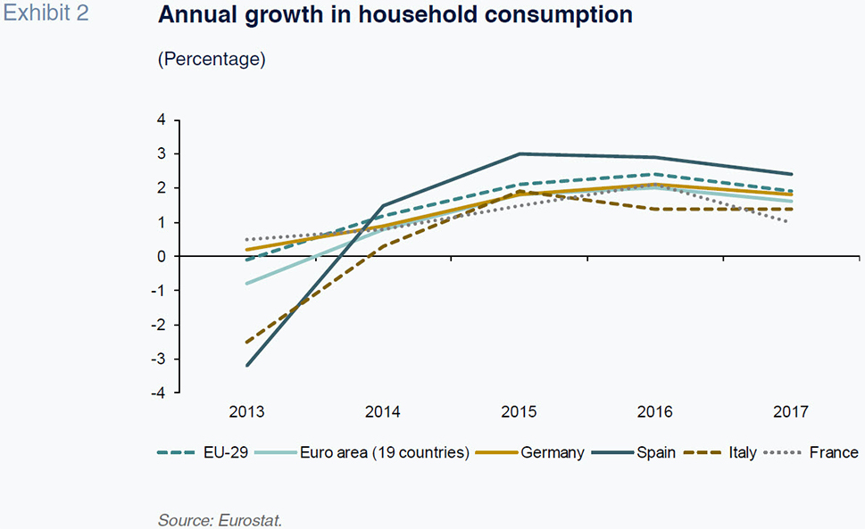 [2] the momentum in Spanish consumer credit can be attributed to the uptick in GDP growth as well as related variables such as the decline in the rate of unemployment and a rise in consumer confidence. All of these variables explain why, after emerging from a recession in the latter part of 2013, Spain’s consumption rate has outpaced the rest of the eurozone (Exhibit 2) since 2014. In 2017, household consumption registered growth of 2.4%, exceeding the EU-29 (1.9%), the eurozone (1.6%) and the main EMU economies (1.8% in Germany; 1.4% in Italy and 1.0% in France). The most recent preliminary data available for the second quarter of 2018 suggest that this expansion has eased with year-on-year growth of 2.2% in the first half (0.2% quarter-over-quarter, compared to 0.7% in the first quarter of 2018), trending below the 2017 rate of 2.4%.