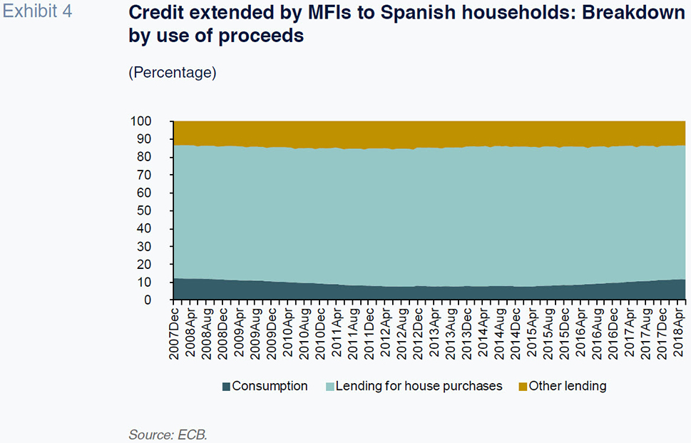[4] this rate is exactly the same as the eurozone average and below both France (13.4%) and Italy (15.6%). As shown in Exhibit 4, consumer credit is primarily used by Spanish households to finance the purchase of homes. Specifically, mortgages currently account for 74.8% of outstanding household credit.