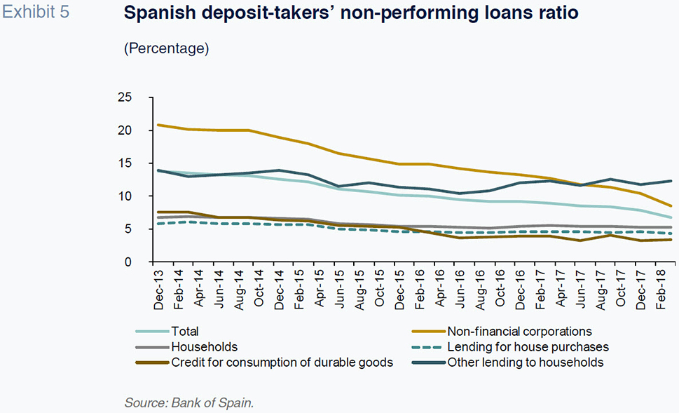 i.e., excluding loans for home and durable goods purchases) stood at 12.3% as of March 2018, barely budging from its high of 13.9% of December 2014. According to the Bank of Spain’s 2018 Financial Stability Report, excluding consumer credit and mortgages, this presents the highest NPL ratio (15.4% in 2017), whereas non-performing loans for consumer credit is lower (5.2%). Likewise, durable consumer goods and non-durable consumer goods loans have NPLs of 3.3% and 7.3%, respectively.
