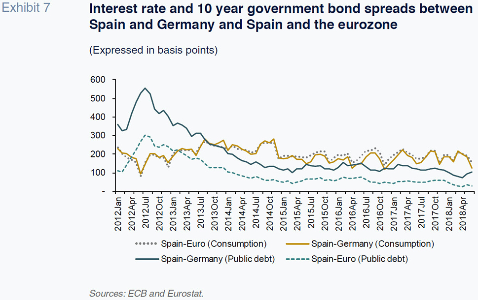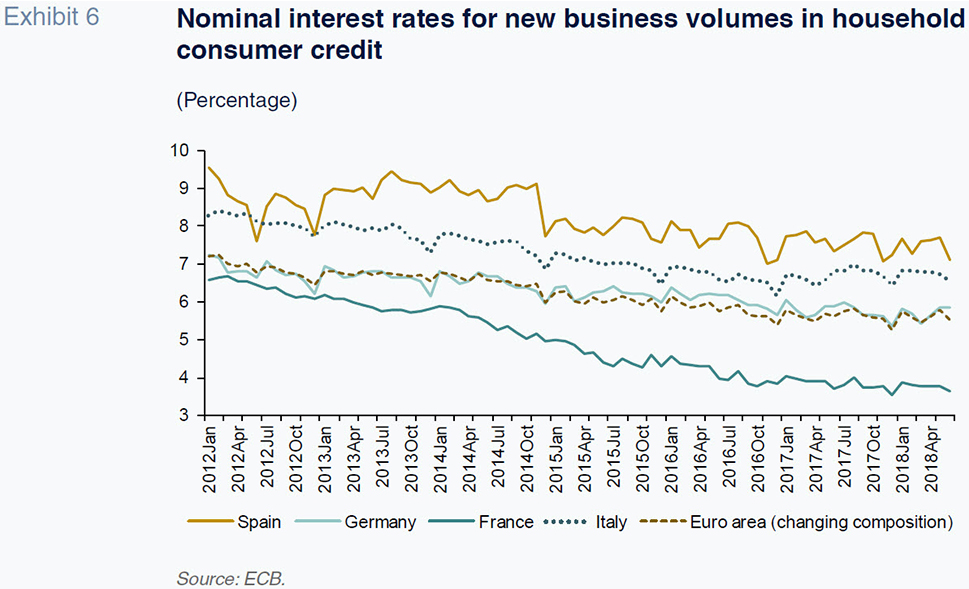 One of the reasons consumer credit has expanded so significantly in Spain is the fall in borrowing costs. Between November 2014 and June 2018, interest rates charged on new transactions decreased by 202 basis points (Exhibit 6), which significantly exceeds the 98 basis points contraction observed in the eurozone. The decline in Spanish borrowing costs is also steeper than in the main eurozone economies. For example, rates decreased by 43 basis points in Germany and 69 basis points in Italy over the same period. However, it is worth noting that consumer credit has always been more expensive in Spain relative to the eurozone and its main economies (with the odd exception such as Italy). Nevertheless, the gap between Spanish and eurozone borrowing costs has narrowed by 104 basis points since November of 2014.