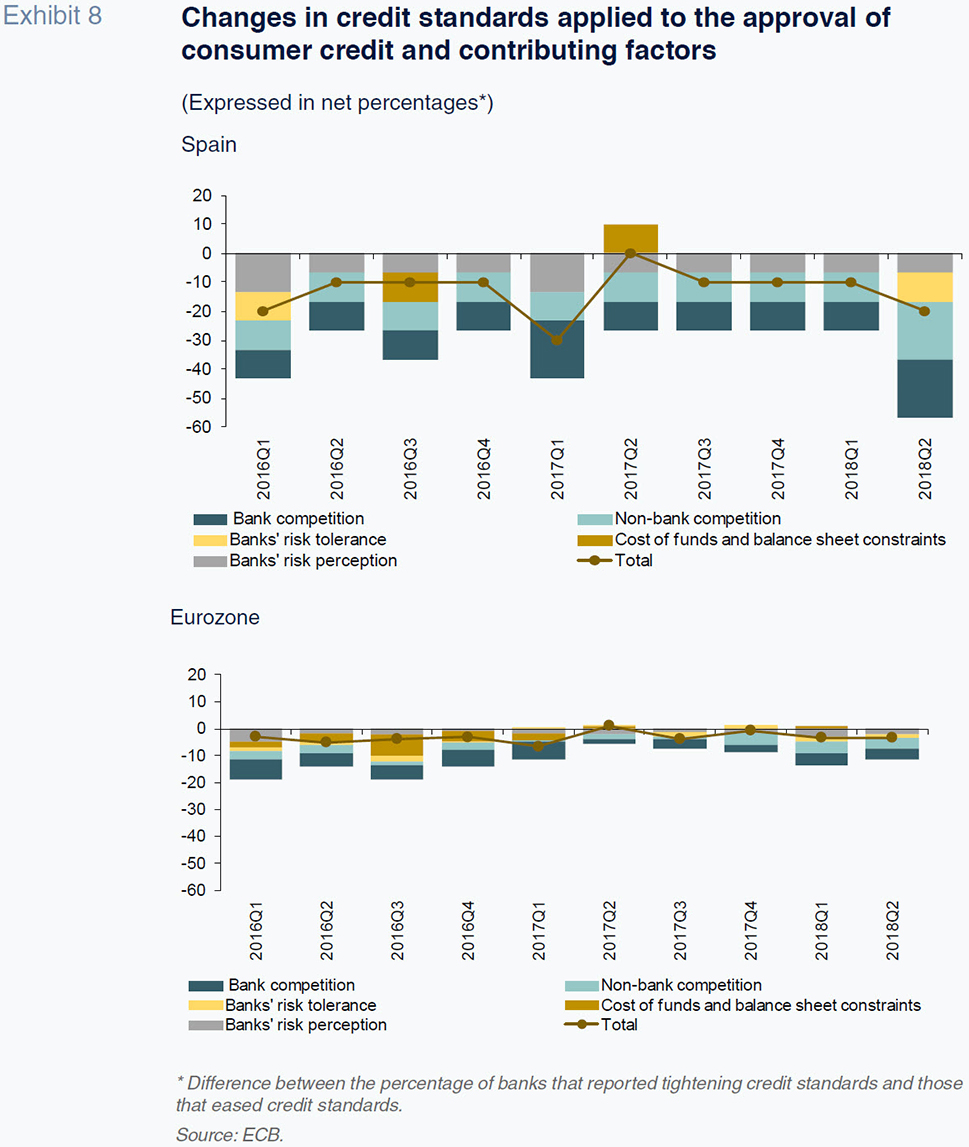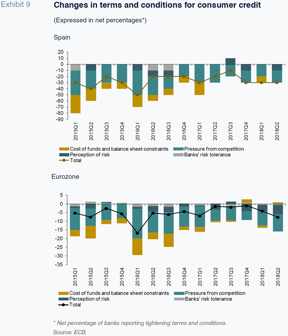 In tandem with the easing of lending criteria for consumer credit, Spanish banks have also been improving the terms and conditions applied to these loans since at least 2015. As shown in Exhibit 9, competitive pressure largely explains this development. Other less influential factors include banks’ reduced perception of risk and the lower cost of funds. The most recent figures, which date to the second quarter of 2018, reveal an overall net percentage of -30, and net percentage points of -20 and -10 for competition and risk perception, respectively. These figures are wider than those of the eurozone banks on average, indicating that in Spain, the terms and conditions applied to consumer credit are improving more vigorously.