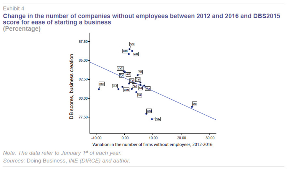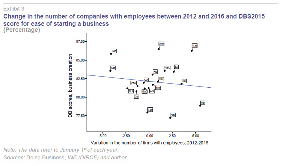 - The analysis does not factor in regional considerations of a historic nature or related to their economic structures. These factors, such as market size (the scale of the customer and supplier network), industrial trajectory or the logistical positioning of each region, may belie a relative greater degree of economic development in a given region irrespective of the DBS2015 regulatory efficiency scores. Spanish companies are not set up in a given region or sector depending solely on theoretically more propitious regional regulations; rather these decisions take into account the pre-existing economic landscape. Company size is another factor omitted from this analysis and one that has a significant impact on an economy’s productivity (Xifré, 2016).