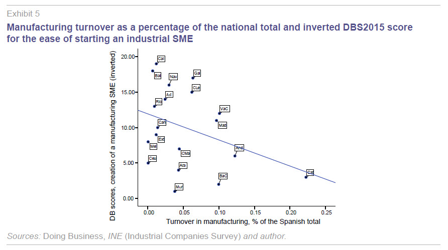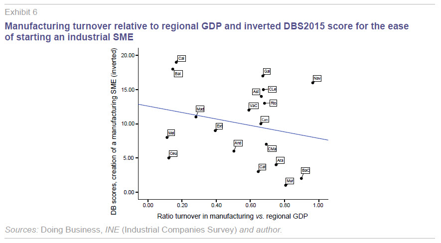 Third and last, the correlation between the DBS2015 scores measuring the ease of setting up an industrial SME and two indicators capturing the importance of manufacturing is analysed. Column one of Table 6 provides the regional breakdown of total national manufacturing turnover using INE survey data. This measure is affected by the size of each region (the smaller regions command, irrespective of the efficiency and competitiveness of their industrial sectors, a relatively lower share of overall manufacturing turnover), which means that any potential correlation with the DBS2015 scores should be analysed more in qualitative rather than in quantitative terms in this instance.