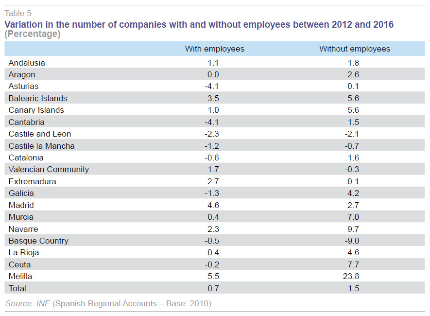 st, 2016, in each region, based on the national statistics bureau’s central companies database (INE-DIRCE), distinguishing between companies (taking any legal form) with employees and businesses without employees (
