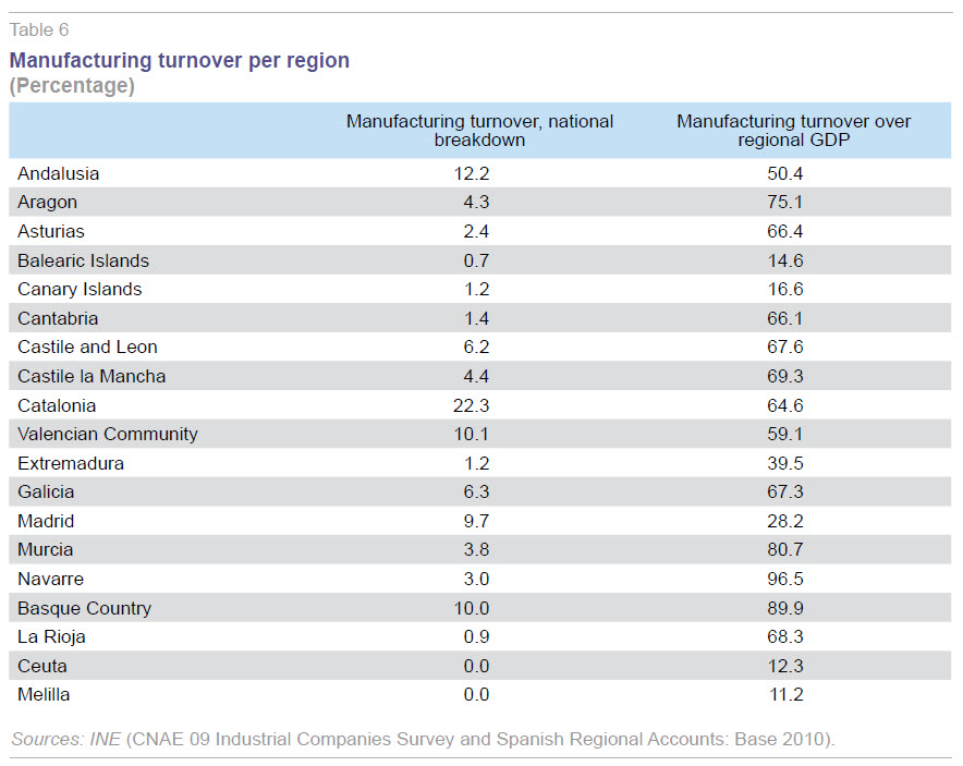 Column two in Table 6 shows manufacturing turnover per region as a percentage of regional GDP. Note that this indicator cannot be interpreted as a direct measure of the relative presence or importance of industry in a given territory as variables are different in nature (turnover represents company revenue while regional GDP calculates the region’s aggregate value added). Nevertheless, this second measure eliminates the regional size skew.