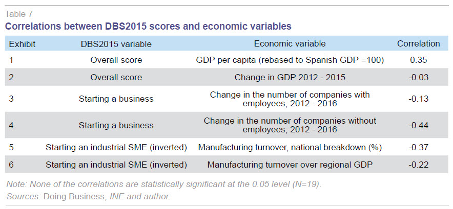 This section analyses the relationship (correlation) between some of the scores provided in the Doing Business in Spain 2015 (DBS2015) report and certain regional economic indicators. By way of summary, Table 7 reports the correlations depicted in Exhibits 1 - 6.